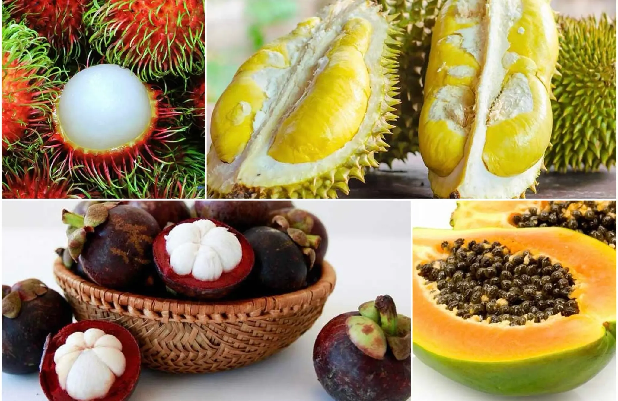 - دوریان (Durian): میوهای با طعمی خامهای و شیرین، اما با بویی بسیار قوی که ورودش به هواپیما و هتلها ممنوع است.