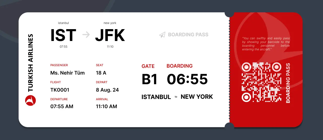بلیطهای ترکیش ایرلاینز طراحی ساده و خوانایی دارند و اطلاعات مهم بهصورت واضح نمایش داده میشود.