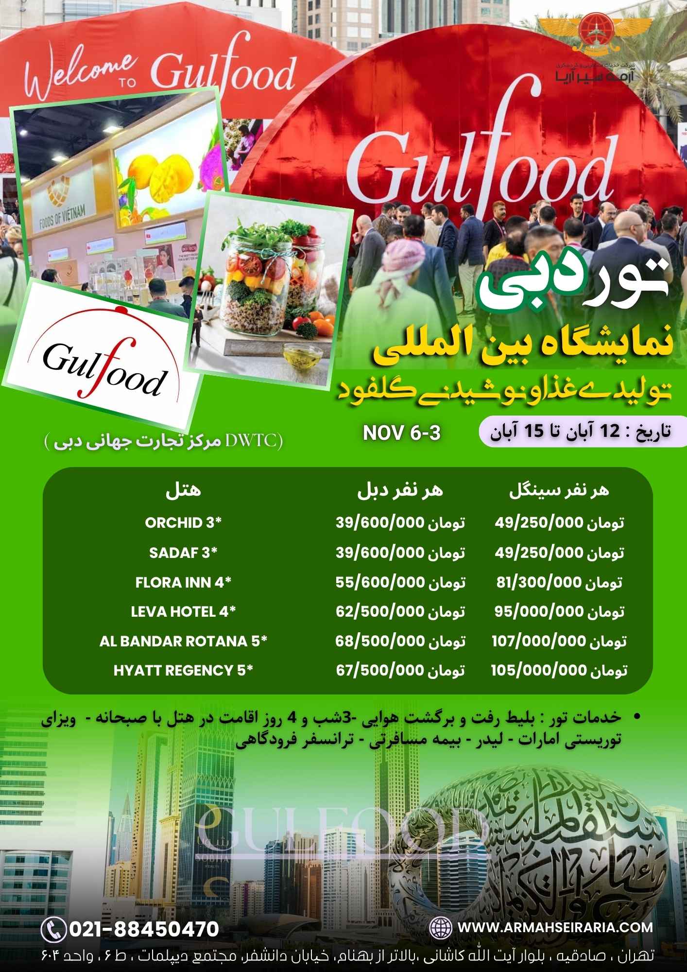 اگر به دنبال حضور در بزرگترین رویداد جهانی در حوزه غذا، نوشیدنی و صنایع وابسته هستید، تور نمایشگاه بینالمللی غذا و نوشیدنی گلفود دبی ۲۰۲۵ (Gulfood 2025) بهترین گزینه برای شماست. این نمایشگاه در مرکز تجارت جهانی دبی (DWTC) برگزار میشود و تور ویژه آن توسط آژانس آرمه سیر آریا اجرا خواهد شد.