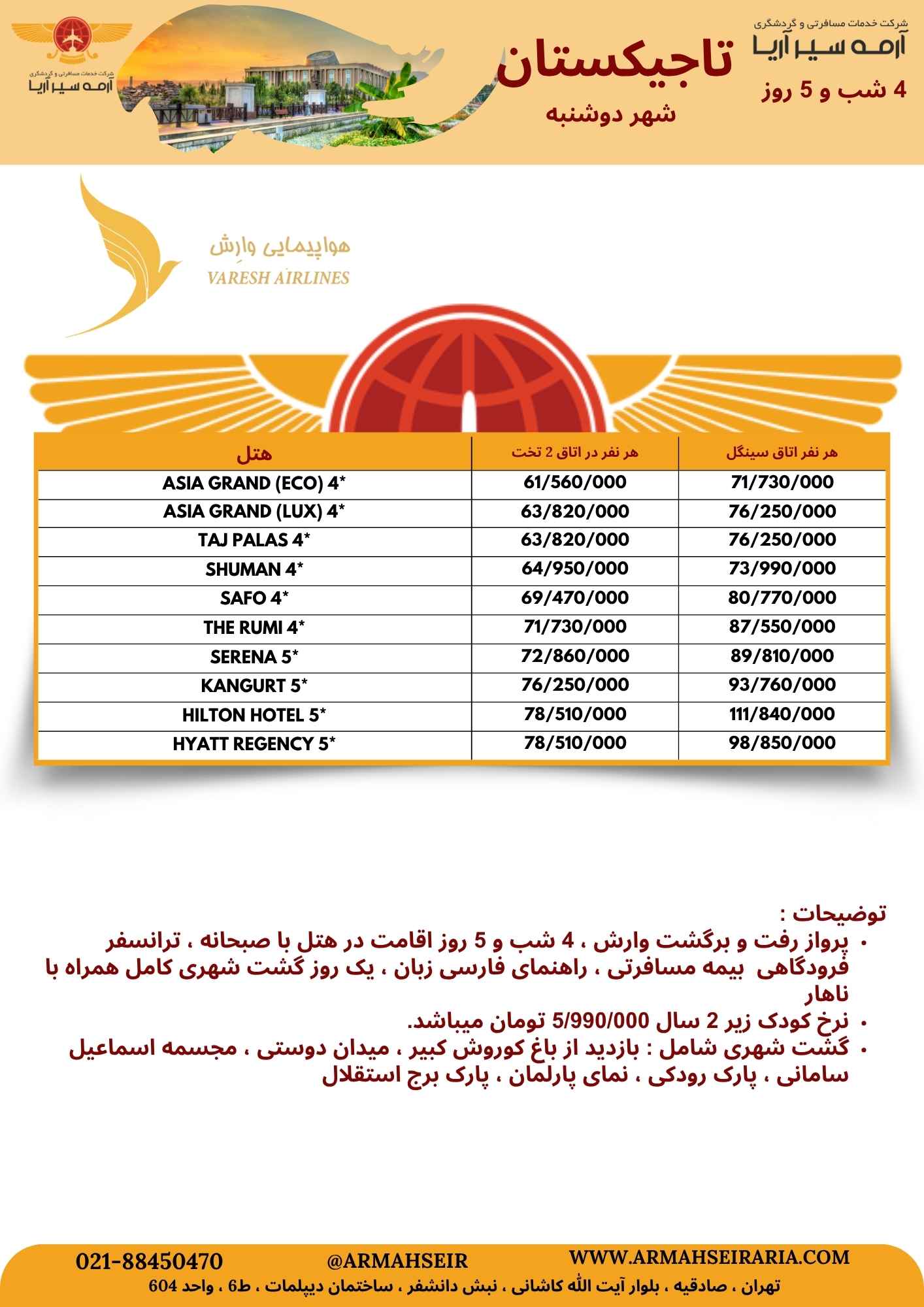 - پرواز رفت و برگشت وارش،4 شب و 5 روز اقامت در هتل با صبحانه، ترانسفر فرودگاهی بیمه مسافرتی، راهنمای فارسی زبان، یک روز گشت شهری کامل همراه با ناهار