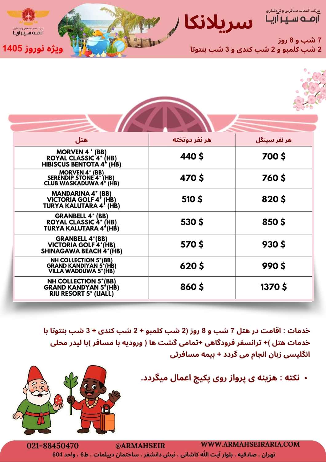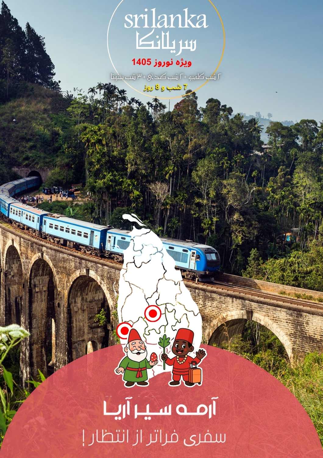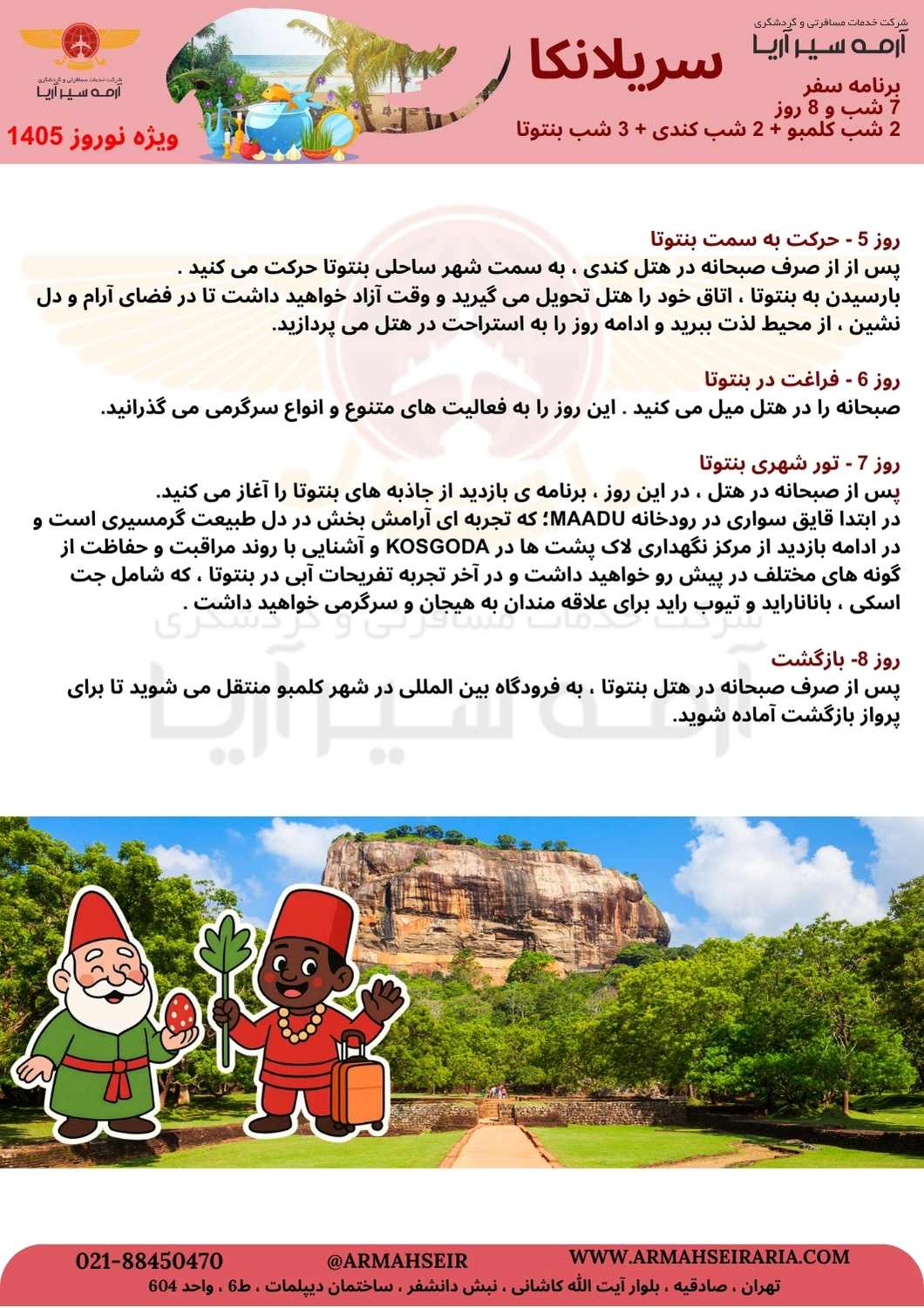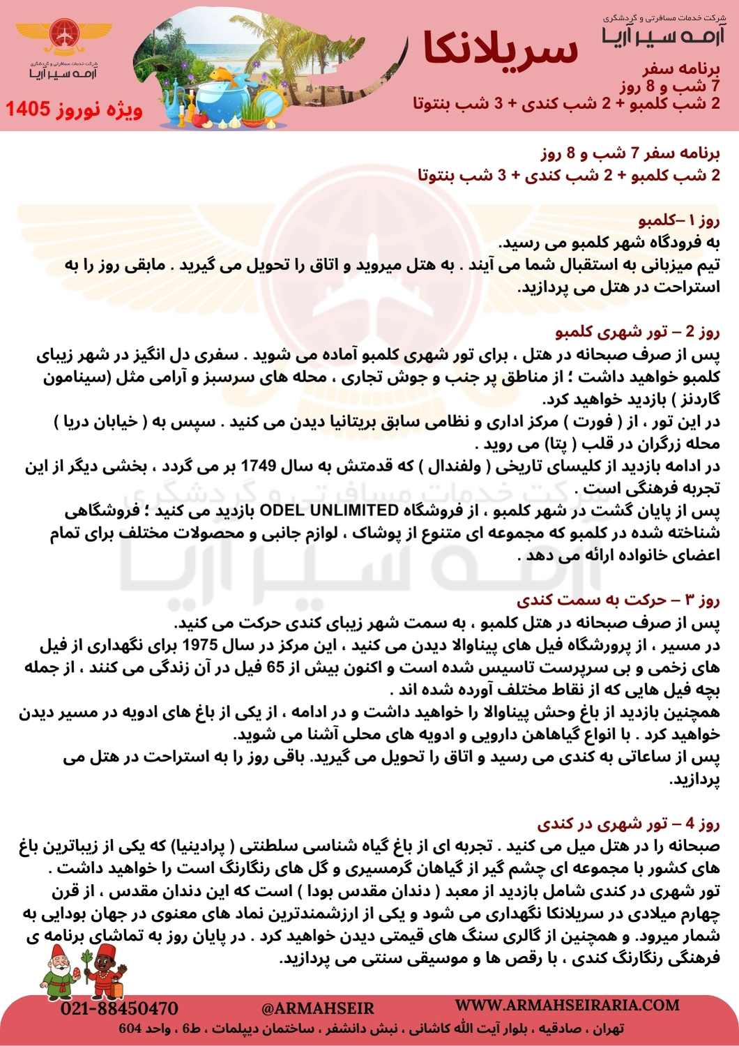 خانه تورهای خارجی سریلانکا 7 شب نوروز 1405 (2 شب کلمبو +2 شب کندی + 3 شب بنتوتا) خدمات: اقامت در هتل 7 شب و 8 روز (2 شب کلمبو + 2 شب کندی + 3 شب بنتوتا با خدمات هتل)+ ترانسفر فرودگاهی +تمامی گشت ها (ورودیه با مسافر)با لیدر محلی انگلیسی زبان انجام می گردد + بیمه مسافرتی نکته: هزینه ی پرواز روی پکیج اعمال میگردد. تاریخ اعتبار از 1404/12/25 تا 1405/01/11 440 دلار هتلها