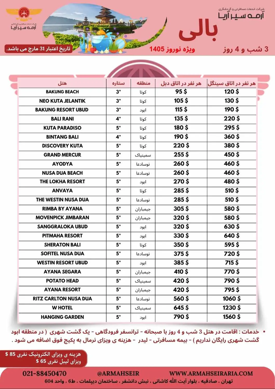 - ویزای نرمال اندونزی روی پکیج 85 دلار می باشد.