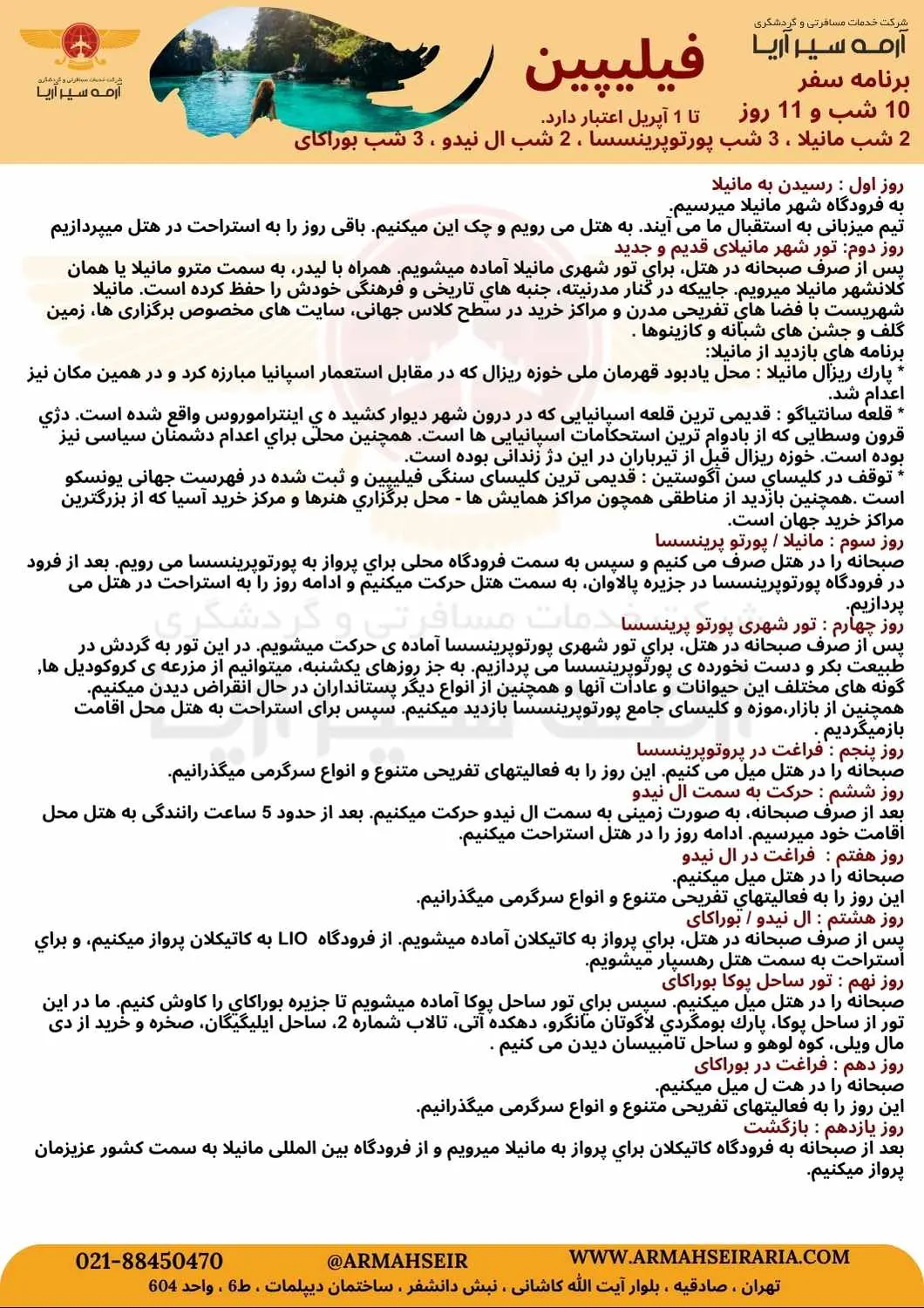 تور فیلیپین 10 شب و 11 روز (2 شب مانیلا، 3 شب پورتوپرینسسا، 2 شب ال نیدو، 3 شب بوراکای)