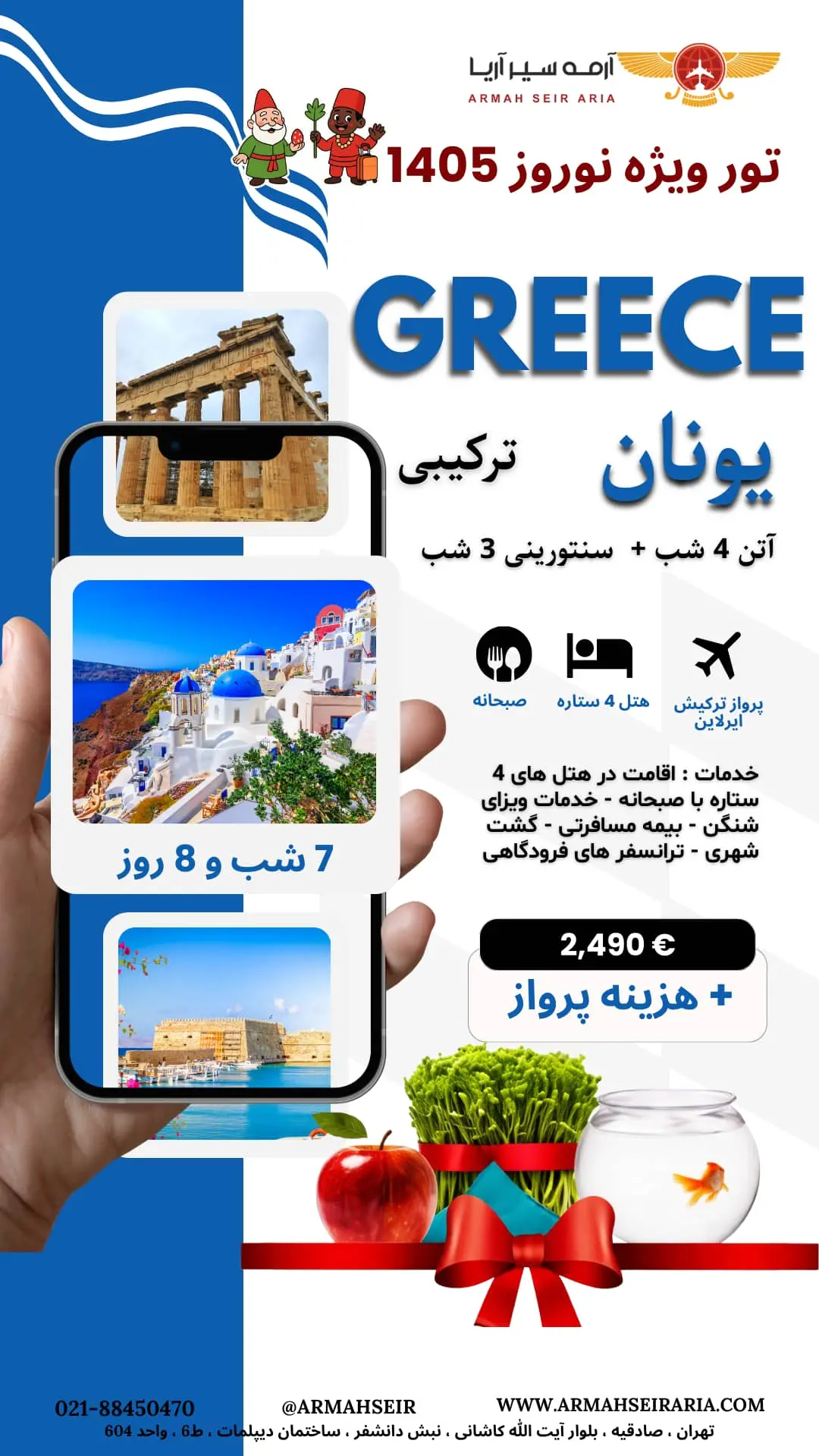 نوروزی رؤیایی در سرزمین اسطورهها؛ از تاریخ و تمدن آتن تا آرامش و زیبایی خیرهکننده سنتورینی. اقامت در هتلهای ۴ ستاره با صبحانه، خدمات ویزای شنگن، بیمه مسافرتی، گشتهای شهری و ترانسفرهای فرودگاهی، همهچیز برای یک سفر اروپایی خاطرهانگیز فراهم است.